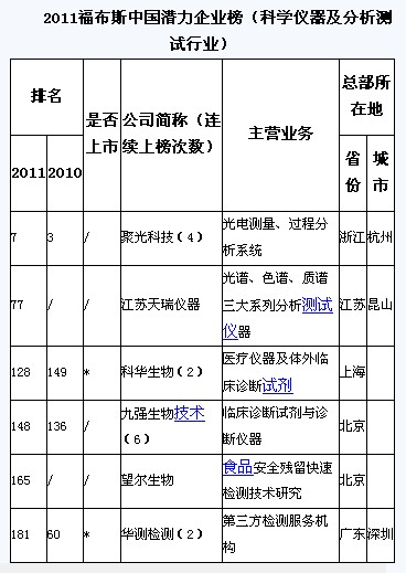 2011年1月10日,《福布斯》中文版在上海發(fā)布其年度首份榜單——2011中國潛力企業(yè)榜,聚光科技、江蘇天瑞儀器、望爾生物、華測檢測等多家科學(xué)儀器及分析測試行業(yè)企業(yè)入選“2011福布斯中國潛力企業(yè)榜”。